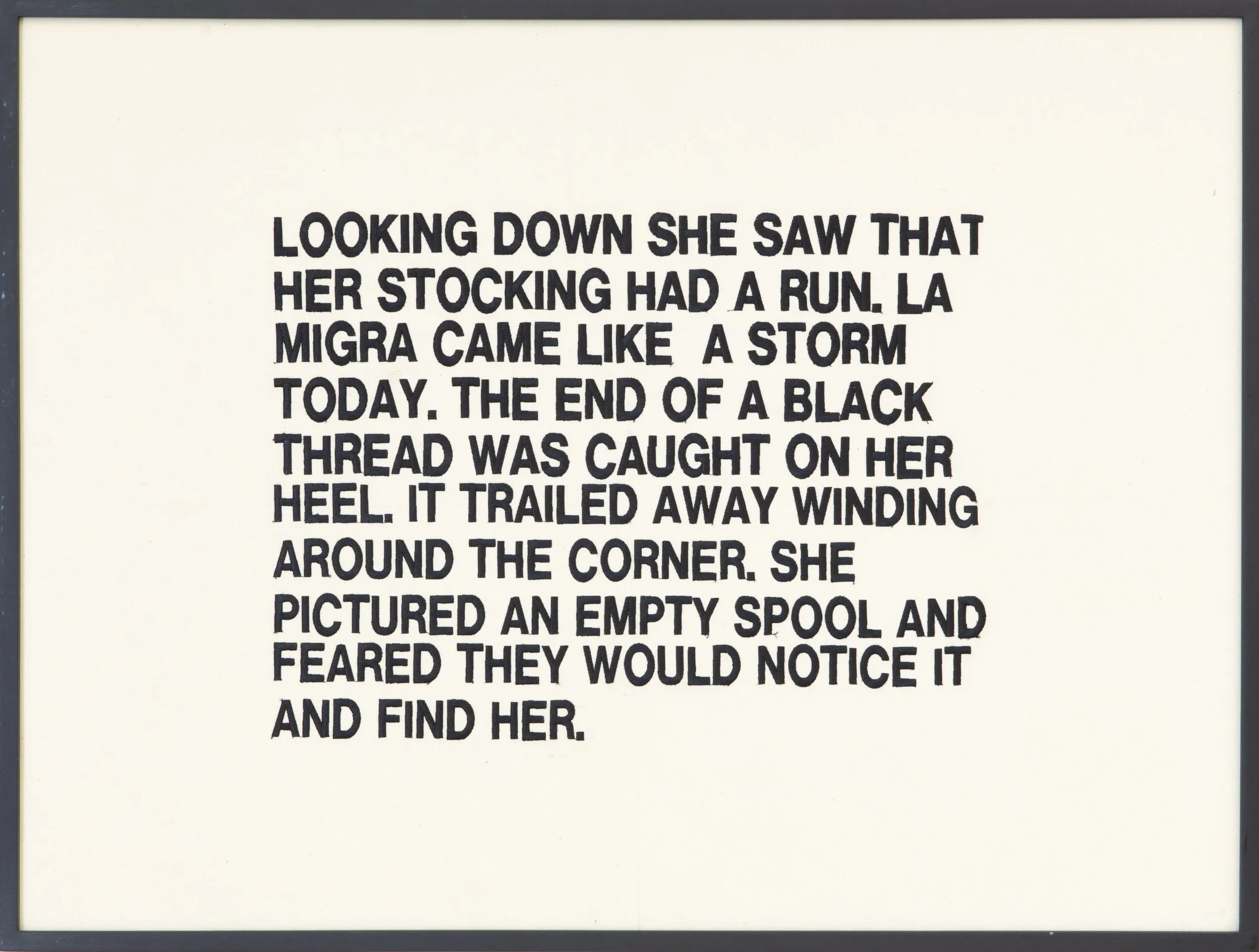 Image: Christina Fernandez (Los Angeles, CA 1965). Manuela Stitched, Text, 2001. Embroidery Panel.